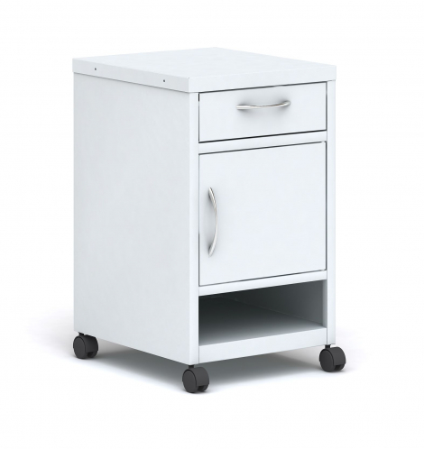 Медицинская тумба предназначена для хранения в медицинских учреждениях как личных вещей, так и медицинскую аппаратуру и документы. Тумбу можно использовать как прикроватную. Тумба включает в себя выдвижной ящик, оснащена вместительным отделением с полой, которое закрыто дверкой с хромированной ручкой. Под отделением открытая ниша, в которую можно складывать любые предметы. Телескопические направляющие обеспечивают свободный и плавный ход ящиков даже при полной загрузке, позволяет выдвигать ящик на всю длину и использовать 100% пространства. Полка выдерживает нагрузку - 15 кг. Тумба оборудована колесами 50 мм, два из них снабжены стопором. Цвет: белый. Тип покрытия: полимерно-порошковое