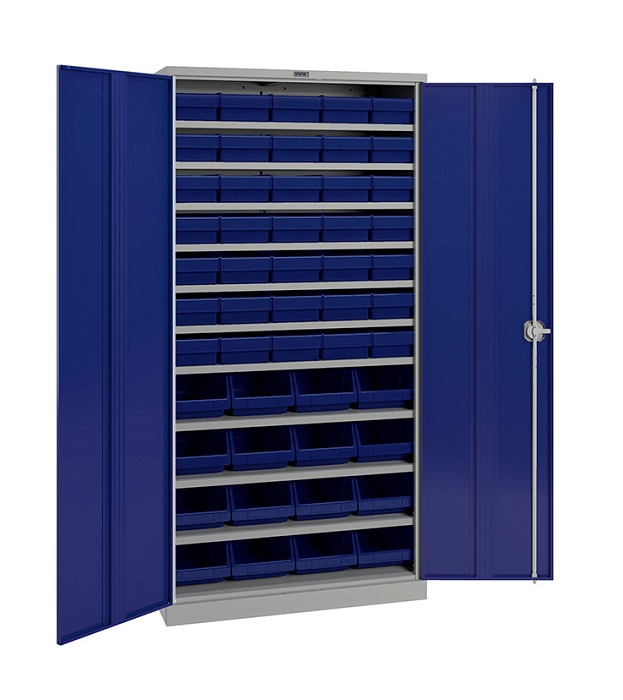 Шкаф ТС 1995-0011000051 предназначен для хранения инструментов, слесарных приспособлений и других изделий на предприятиях, мастерских, автосервисах. Шкаф оборудован пластиковыми ящиками. Изделие сертифицировано на соответствие требованиям ГОСТ Р 58864 и ГОСТ Р 16371. Максимальная нагрузка на шкаф ТС-1995 - 500 кг, на полку - 80 кг. В комплектацию шкафа ТС 1995-0011000051 входит: шкаф ТС 1995 1 шт, TC полка большая TCSh 95х47 10 шт, пластиковые ящики 400х185х100 мм 35 шт, пластиковый ящик 400х230х150 мм 16 шт . Шкаф закрывается ключевым замком с ручкой (CyberLock, 2000 комбинаций, 2 ключа в комплекте). Ригели из оцинкованной стали и пластиковые втулки обеспечивают бесшумный ход дверей и надежное запирание шкафа. Цвет: корпус шкафа, полки - серые Ral 7038, двери, ящики - синий Ral 5002, шагрень. Шкаф поставляется в разобранном виде.