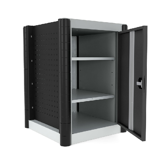 Боковые перфорированные стенки тумбы и опоры позволяют размещать на них различные стандартные аксессуары.