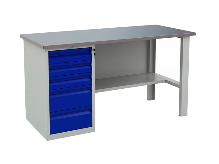 В данную комплектацию входит: столешница WT-160, опора WF-1, полка/стенка WSh-160/1, тумба Рrofi WD-5. Столешница изготовлена из плиты МДФ толщиной 24 мм и оцинкованного листа металла толщиной 1,2 мм. Столешница имеет отверстия для крепления к тумбе и опоре. Опора WF-1 не регулируемая по высоте. Имеет нижнюю перекладину для усиления устойчивости конструкции. Полка и стенка устанавливается между опорой и тумбой верстака. Тумба Profi WD-5 комплектуется пятью выдвижными ящиками оборудованными телескопическими направляющими, которые обеспечивают 100% выдвижения ящиков. Полезные размеры ящиков (ВхШхГ) 3 верхние - 100х380х600 мм, 2 нижних- 190х380х600 мм. Тумба WD-5 закрывается центральным ключевым замком Практик. Цвет: корпус - серый Ral 7038, ящики и двери тумб - синий Ral 5002. Верстак поставляется в разобранном виде.