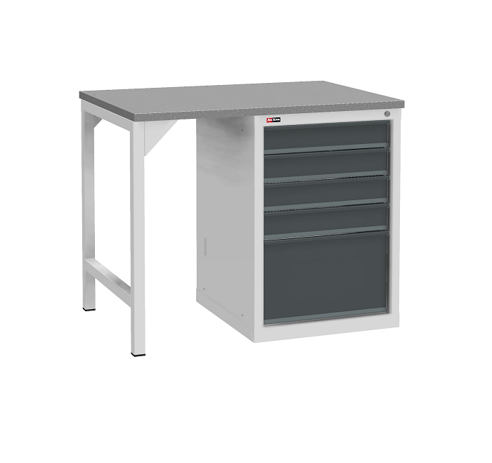 В комплектацию верстака входит: столешница ВЛ-К 100, одна опора ВЛ-К, косынки для опоры ВЛ-К, тумба ВЛ-К-015. Столешница выполнена из фанеры (24 мм) с покрытием из оцинкованного листа металла. Тумба ВЛ-К-015 комплектуется 5 выдвижными ящиками с телескопическими направляющими. Полезный размер ящиков (ВхШхГ): 1-280х459х459 мм, 4-80х459х459 мм. Тумба закрывается центральным ключевым замком (50 000 циклов). Опора сварная. Размер опоры (ВхШхГ) - 800х40х660 мм.