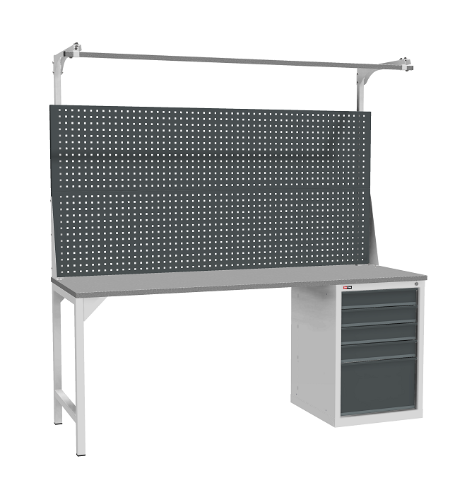 В комплектацию верстака входит: столешница ВЛ-К 200, одна опора ВЛ-К, косынки для опоры ВЛ-К, тумба ВЛ-К-015, два перфорированных экрана ВЛ-К.