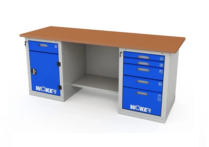 В комплектацию верстака входит: столешница Woker 2000, одна тумба Woker 02, одна тумба Woker 05, полка/стенка Woker. Столешница выполнена из шлифованной березовой многослойной фанеры толщиной 30 мм. Снаружи фанера обработана влагостойким антисептиком цвета "красное дерево", что придает фанере повышенную влагостойкость и более темный цвет. Тумба Woker 02 имеет одну регулируемую по высоте полку (шаг 50 мм). Полка тумбы установлены на стальные салазки, которые позволяют выдвигать полку на себя на 70% для облегчения разгрузки/погрузки. Дверь тумбы закрывается на цилиндрический замок со стальной поворотной ручкой, секретность замка 2000 комбинаций. Открывание двери на 180 градусов. Тумба Woker 05 комплектуется 5 выдвижными ящиками (2 высотой - 135 мм, 2 высотой - 65 и 1 высотой - 275 мм). Полезный размер ящика: (ШхГ) 459х612 мм. В ящиках есть противоскользящие коврики и набор наклеек с пиктограммами для маркировки содержимого. Полка/стенка верстака выполнена из стального листа толщиной 1 мм.